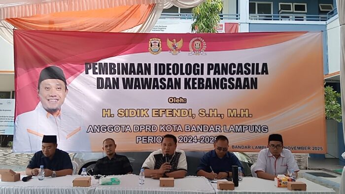 BANDAR LAMPUNG — Pimpinan DPRD Kota Bandar Lampung, H. Sidik Efendi, S.H., M.H., kembali melanjutkan kegiatan Sosialisasi Pembinaan Ideologi Pancasila dan Wawasan Kebangsaan (PIP–WK). Kegiatan yang digelar secara berkesinambungan ini kali ini berlangsung di Kelurahan Sukabumi, Kecamatan Sukabumi, Minggu (23/11/2025).